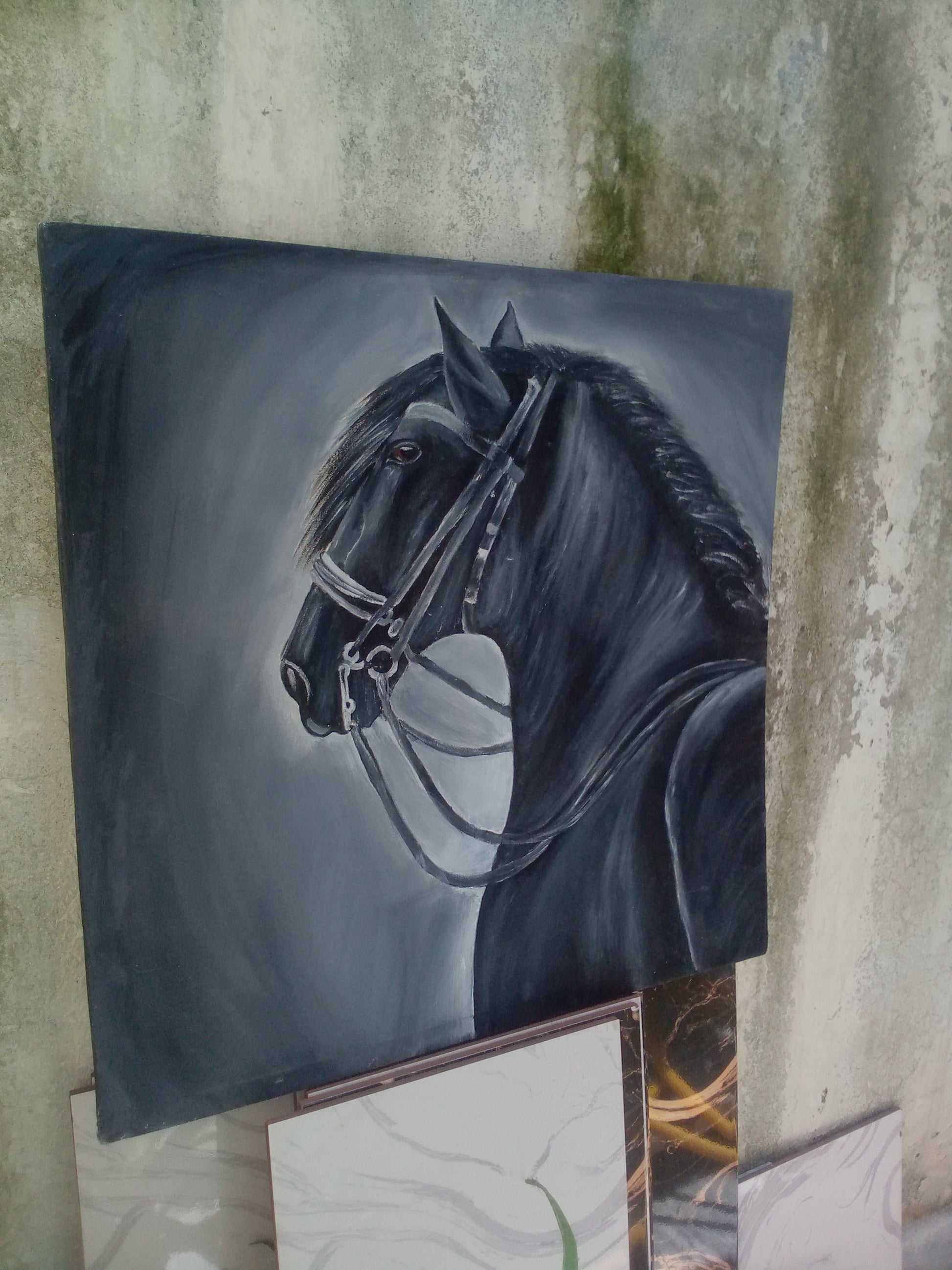 Bring strength, power, and elegance to your walls with this stunning hand-painted portrait of a black horse. The detailed brushwork highlights the horse’s graceful stance, glossy mane, and fine bridle, creating a bold and captivating artwork.