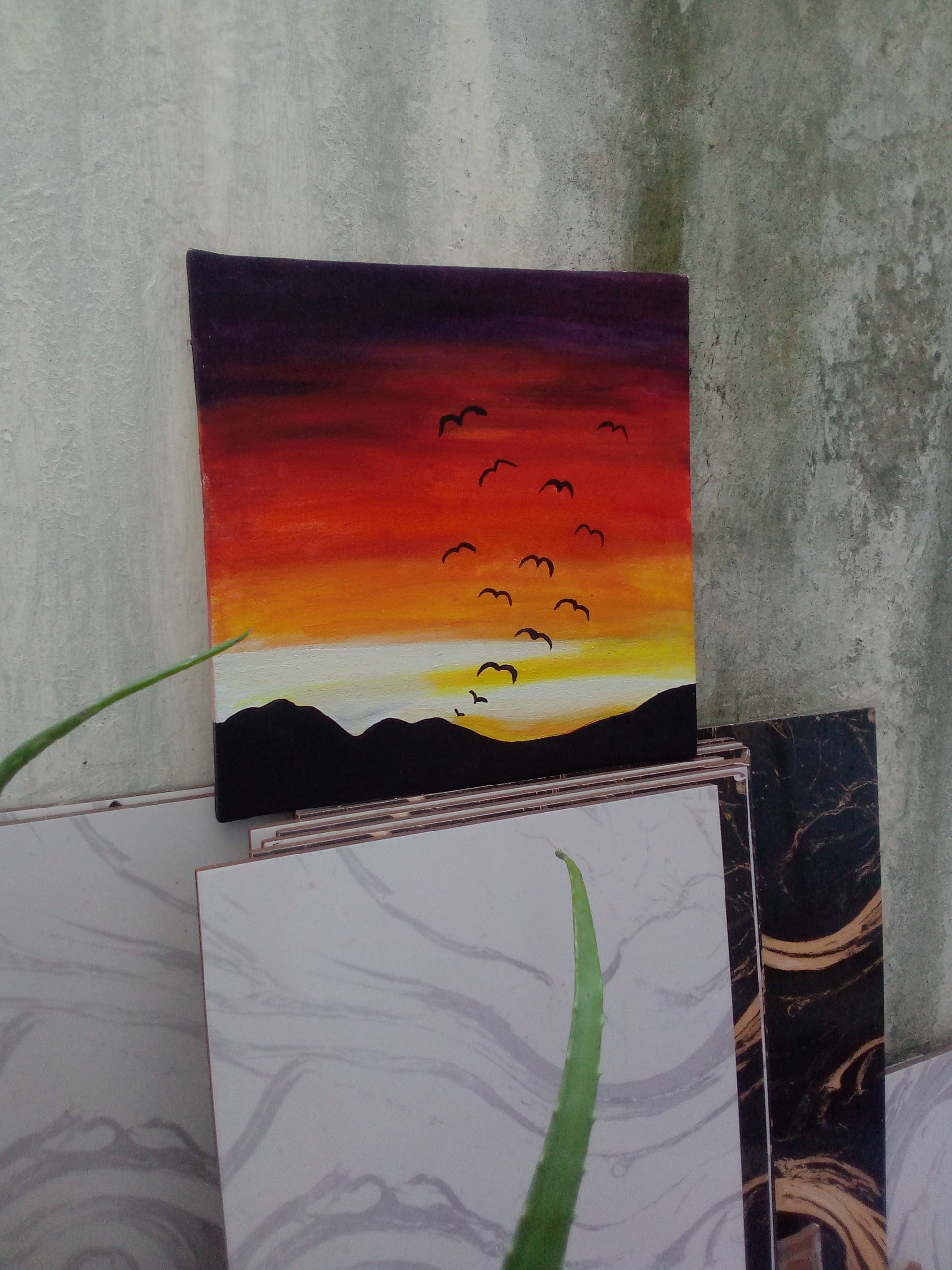 "Add a touch of serenity to your space with this beautiful hand-painted sunset canvas. The vibrant colors and silhouette of birds flying against a breathtaking sky create a captivating visual experience. Perfect for art lovers and those looking to enhance their home decor with a unique piece."